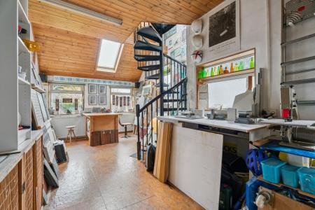 From the kitchen, a door leads to a versatile studio space complete with a sink unit and Velux window, making it ideal for home working, hobbies or guest accommodation. A striking black metal spiral staircase rises to a large vaulted room with impressive window, currently used as a study but equally suitable as an additional bedroom. A further door from the studio provides internal access to the garage, which is spacious enough for one vehicle and benefits from an up-and-over door and another door leads to both the garden and the streets.