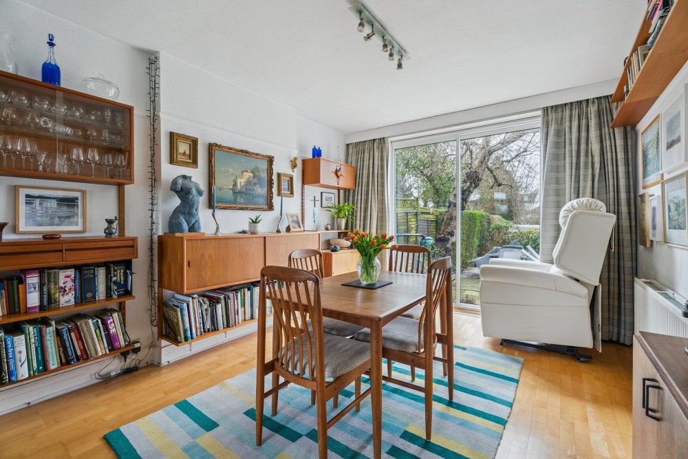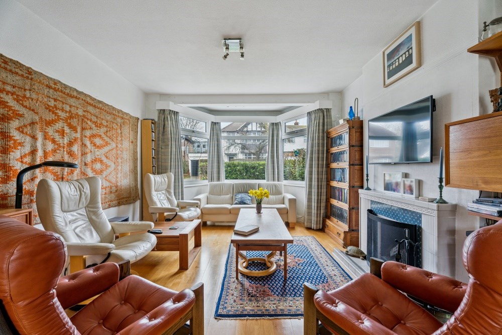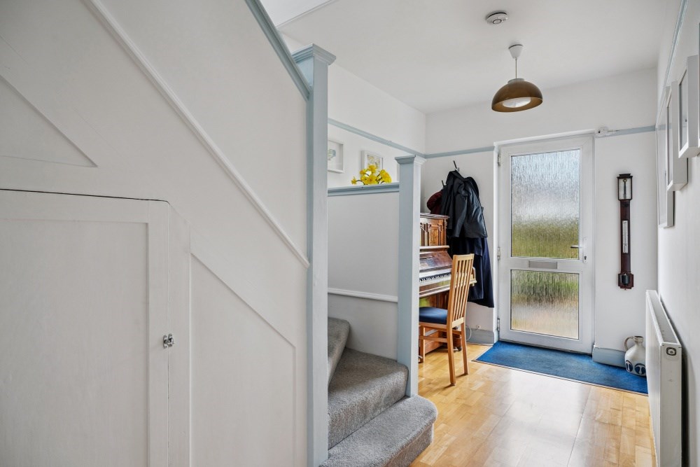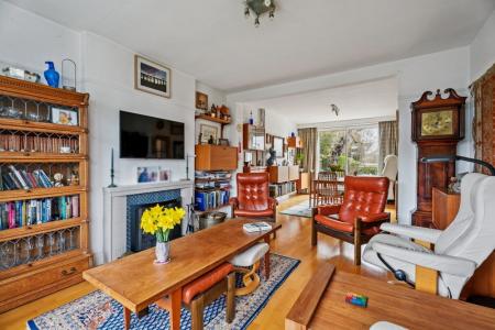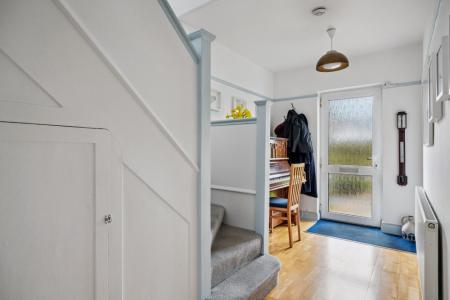 Upon entering, you are welcomed by a spacious entrance hall, setting the tone for the generous proportions throughout. A glazed door opens into a bright dual-aspect living/dining room featuring high ceilings, attractive strip wood flooring and a charming tiled fireplace. A bay window to the front floods the room with natural light, while sliding patio doors open directly onto the rear garden and patio area, creating an ideal space for both everyday living and entertaining. The hallway also benefits from an understairs storage cupboard and a convenient downstairs cloakroom with WC.