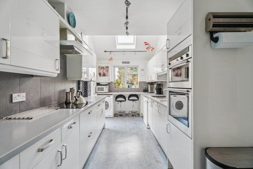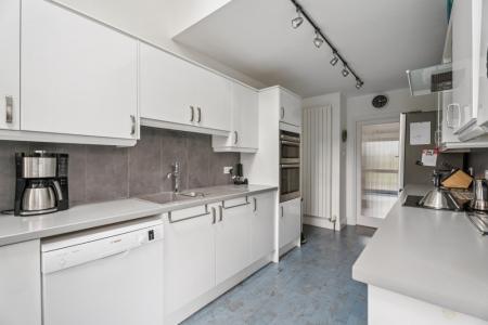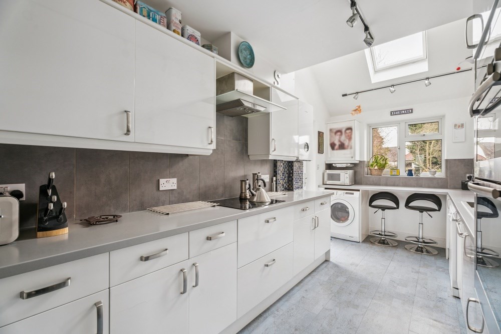 The kitchen is fitted with an extensive range of wall and base units, offering excellent storage and workspace. It includes plumbing for a washing machine and dishwasher, a double oven and a Worcester gas boiler. A breakfast bar provides seating for two and enjoys pleasant views over the garden, with a rear door offering direct access outside.