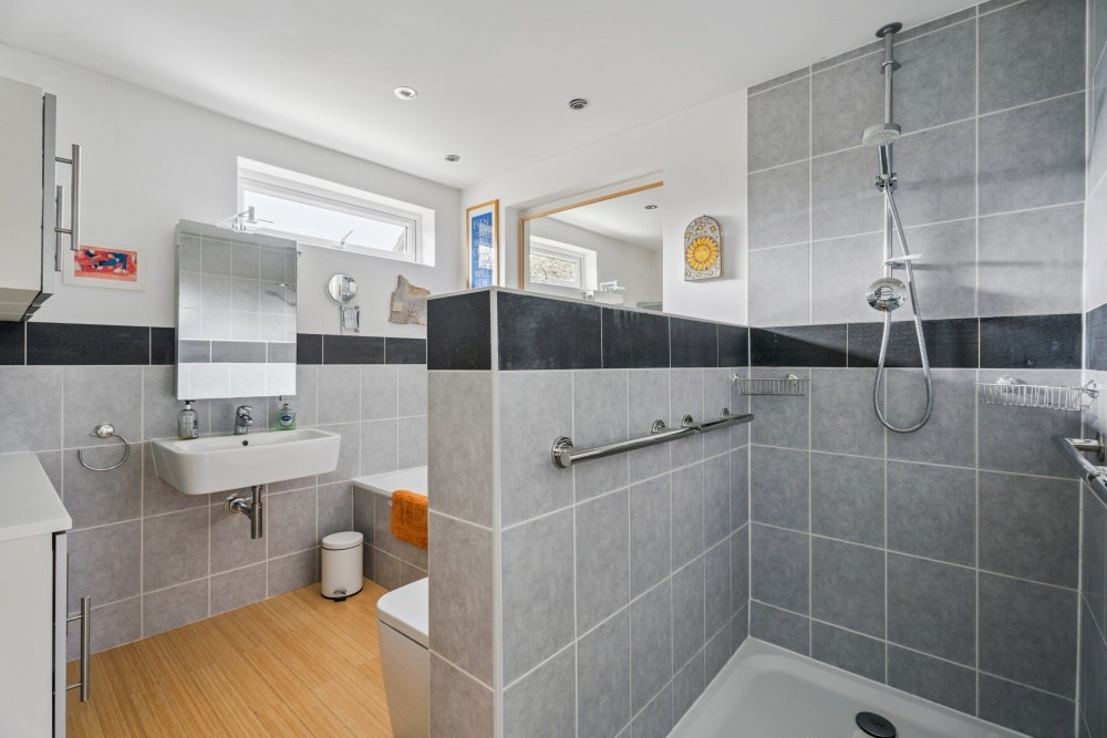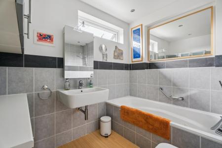 Upstairs, there are three bedrooms comprising two generous doubles and a single room. The principal bedroom enjoys a bay window to the front aspect. The property also boasts a particularly large family bathroom, fitted with an extra-large shower, separate bath, and an array of wall and floor cabinetry, along with access to the loft via a hatch.