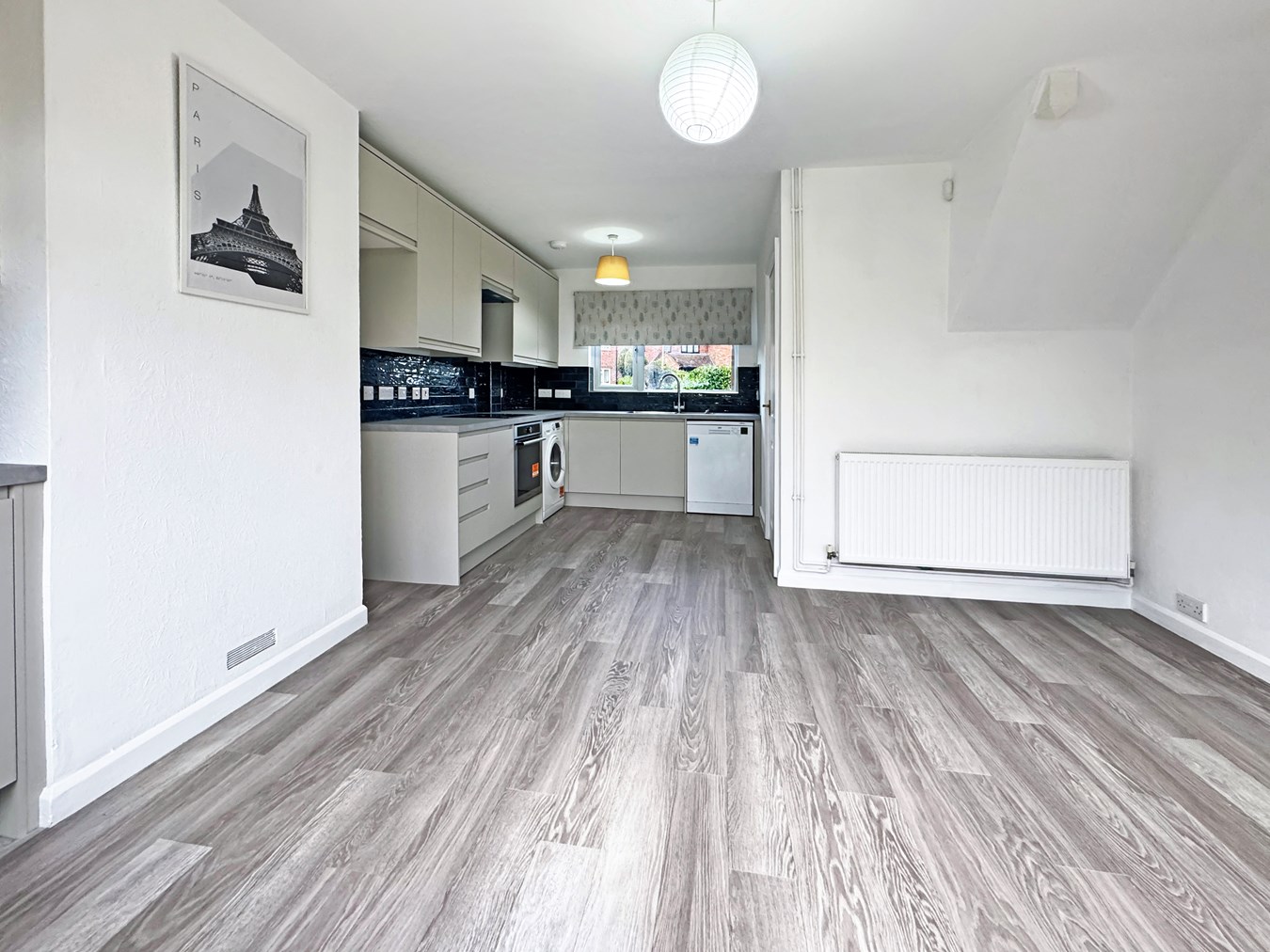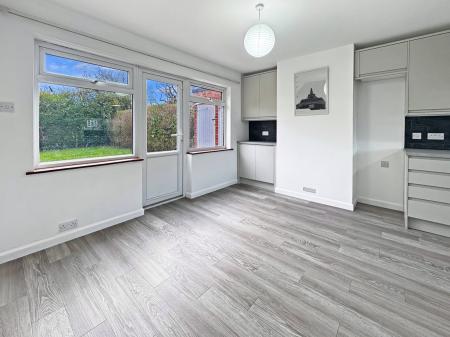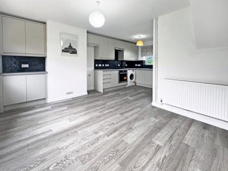 The entrance leads into a sun drenched double aspect lounge with feature electric fireplace and bay window to the front. The newly fitted, contemporary kitchen opens into a dining/living space with a door leading onto the garden patio. There are ample cabinets and worksurfaces along with fitted appliances.