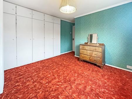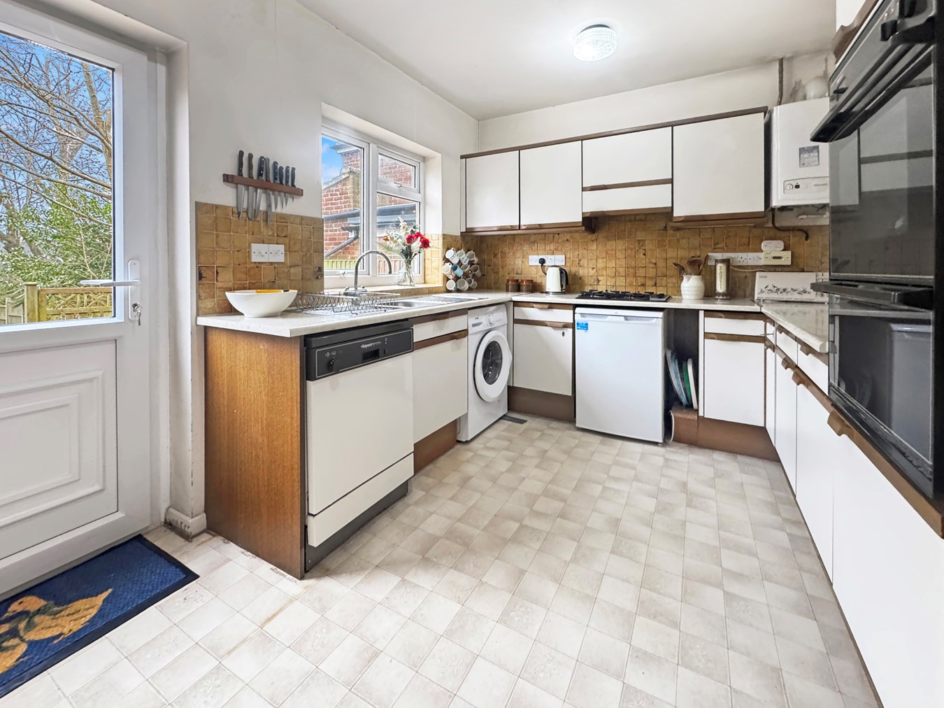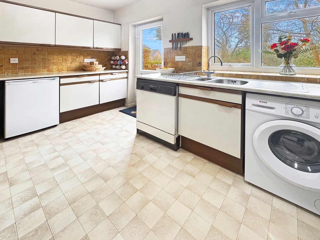 An arch from the dining room leads into a good-sized kitchen, fitted with a range of floor and wall cabinets and a laminated worktop. The kitchen is equipped with a gas hob and extractor, electric oven, washing machine, fridge freezer, and plumbing for a dishwasher, providing a practical and functional space with scope for modernisation.