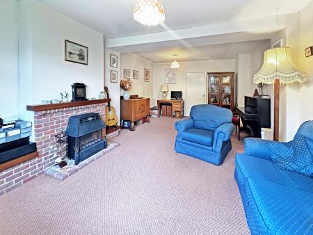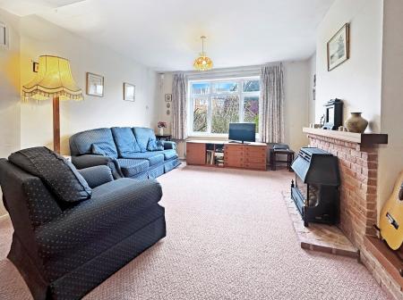 Downstairs accommodation comprises a generous front living room, featuring a traditional brick fireplace with timber mantel, creating a charming focal point. A door from the living room leads to a separate dining room, offering a versatile space for formal dining or family meals.