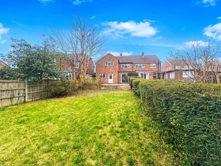 To the rear, there is a generous garden commencing with a large patio area perfect for outdoor entertaining, leading onto a lawned area enclosed by established hedgerows and panelled fencing. A timber garden store shed is positioned at the rear, providing practical storage space.