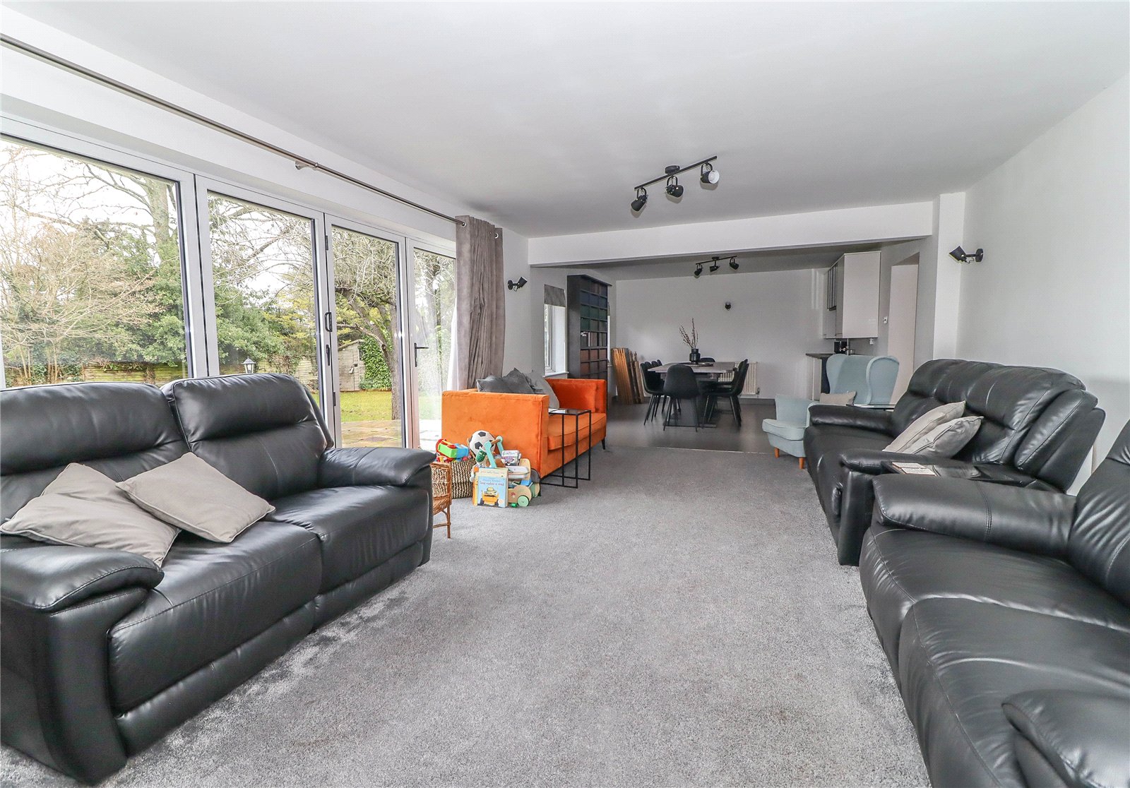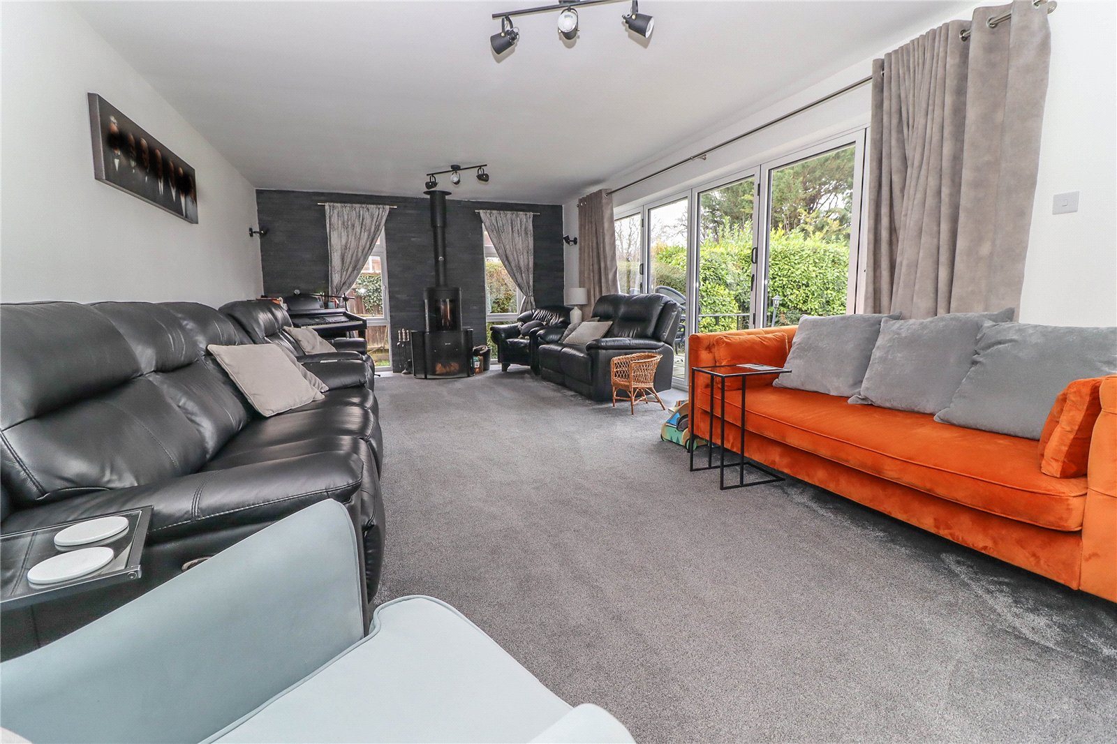 Living Room Aluminium frame folding glazed doors open onto the rear terrace and main garden. Raised barrel shaped log burning stove with exposed flue and porcelain hearth. Textured slate feature wall behind with tall windows to either side of the chimney breast. Ceiling and wall light points. Central deep inset carpet with porcelain margin tiling. Wide opening into: