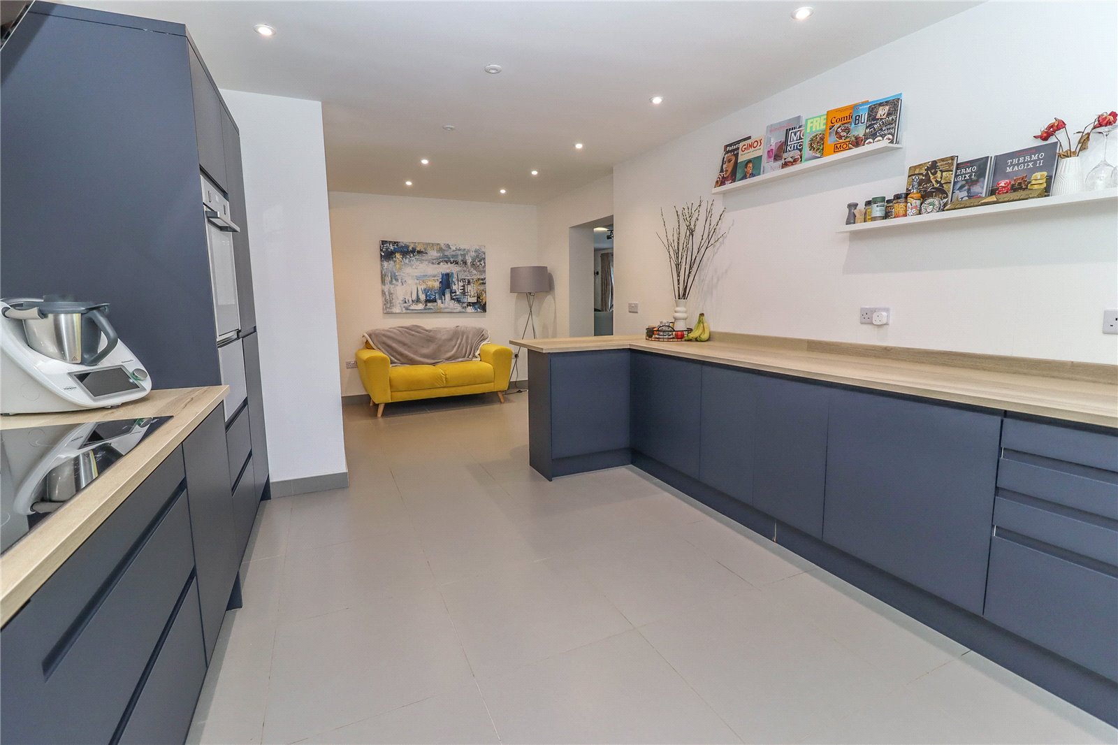 Kitchen/Breakfast Room Large and ideal for family life. Long timber effect work surfaces with similar upstands and peninsular with breakfast bar to one side. An extensive range of midnight blue handleless, high and low level cupboards and drawers including a range of pan drawers. White ceramic 1? bowl sink unit with drainer, mixer tap and Insinkerator. Two large built in Neff ovens each with grill and deep separate warming drawer beneath. Integrated larder fridge and freezer. Integrated dishwasher. Display shelving. Chrome drying rail. Porcelain tiled flooring and skirting. LED downlighters. Access into utility area. Access to side of peninsular where there is space for a breakfast table and wide opening into: