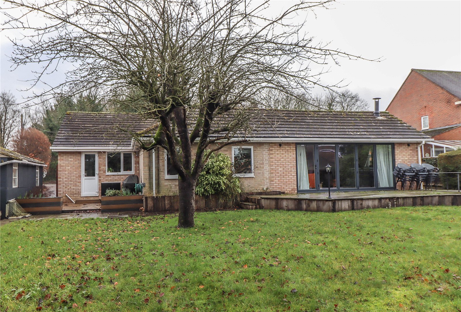 A large detached bungalow with fully modernised accommodation extending to over 1700 sq ft together with a pre-fab double garage and extensive gated driveway. The plot extends to about 0.3 of an acre with the main, well enclosed garden lying to the rear. Internally the space has been reconfigured and comprises porch, reception hall, large open plan living room with separate dining area including a bar. A spacious central kitchen/breakfast room with integrated appliances and a separate adjoining utility. The principal bedroom features the dressing room and well appointed shower room. The are three additional bedrooms (one en suite) and a family bathroom.
