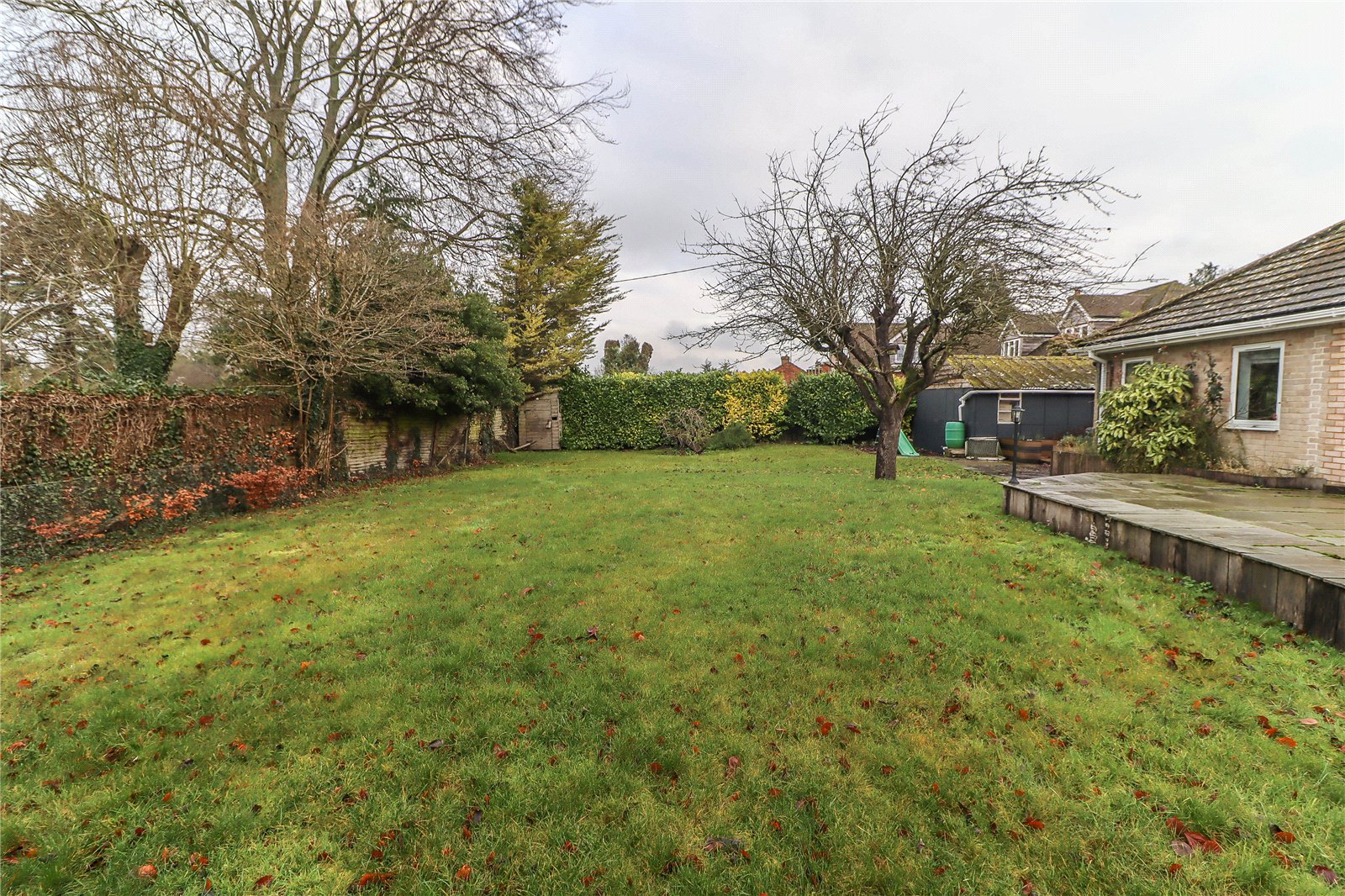 Rear Garden Raised Sandstone terrace over vertical sleeper sides ideal for barbeques and entertaining, stepping down onto a good sized level lawn well, enclosed by hedging and fencing. Mature apple tree, raised vegetable beds extend behind the garage. Further raised planters for shrubs and herbs by composite deck outside utility. Outside lights and tap.