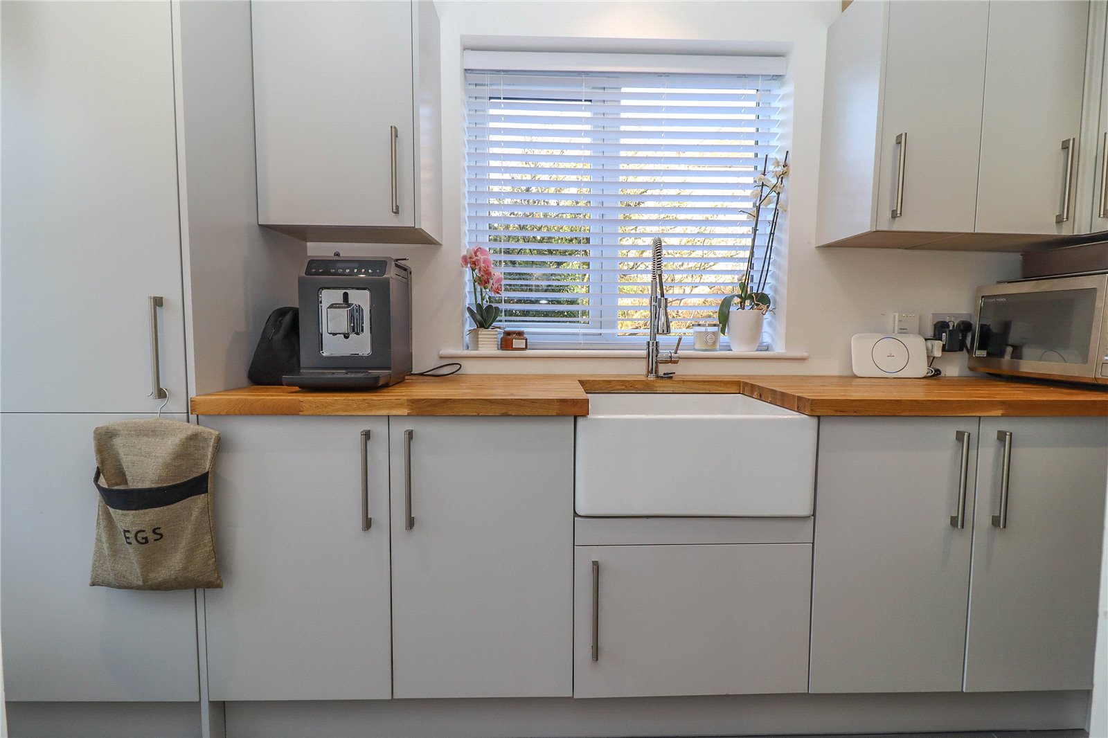 Utility Oak block work surface. Inset Belfast sink unit with central mixer tap, a range of high and low level cupboards including a tall shelved pantry cupboard. Space and plumbing for washing machine with room above to stack dryer. Water softener. Porcelain tiled flooring and skirting. Half glazed door to rear garden. Window to side aspect. LED downlighters and loft hatch.
