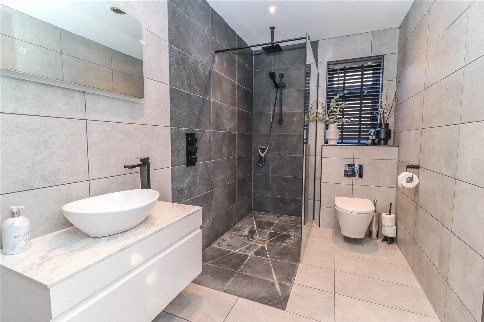En Suite Shower Room Large and well appointed. Contemporary raised wash hand basin with side mixer tap on floating wash stand with storage beneath. Electric mirror above. Low level WC with concealed cistern. Walk in tiled wet area with coloured glass screen to one side, central floor drain and overhead and handheld shower attachments. Fully tiled walls and floor. Matt black towel radiator. Obscure glazed window. LED downlighters and extractor fan.