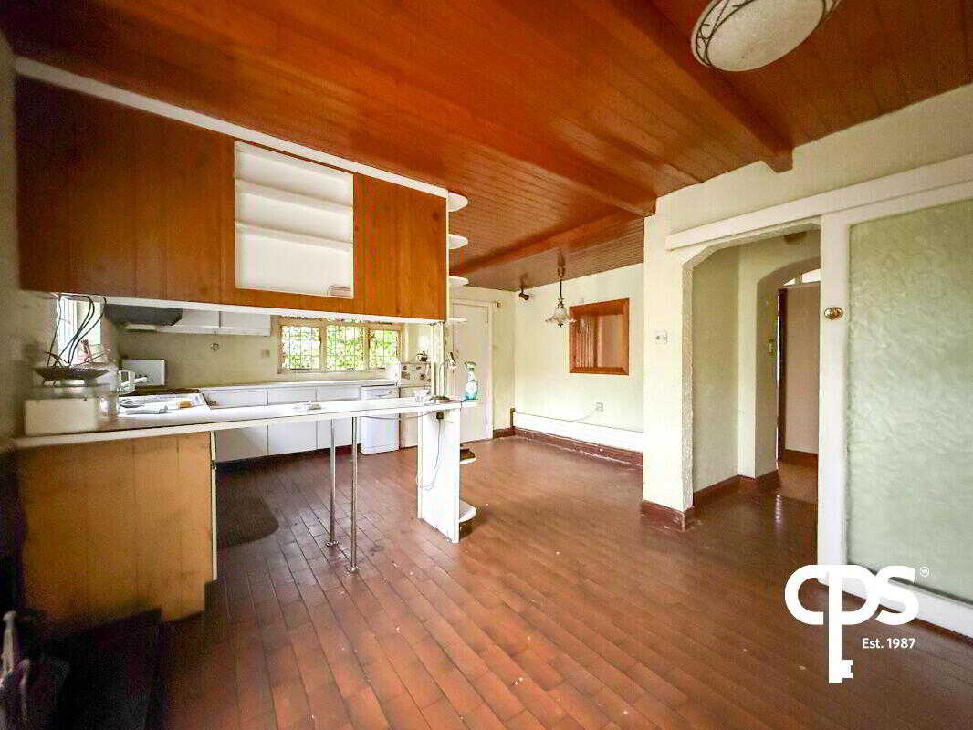 Generous kitchen with tiled flooring and radiator, offering ample space for kitchen units and dining.