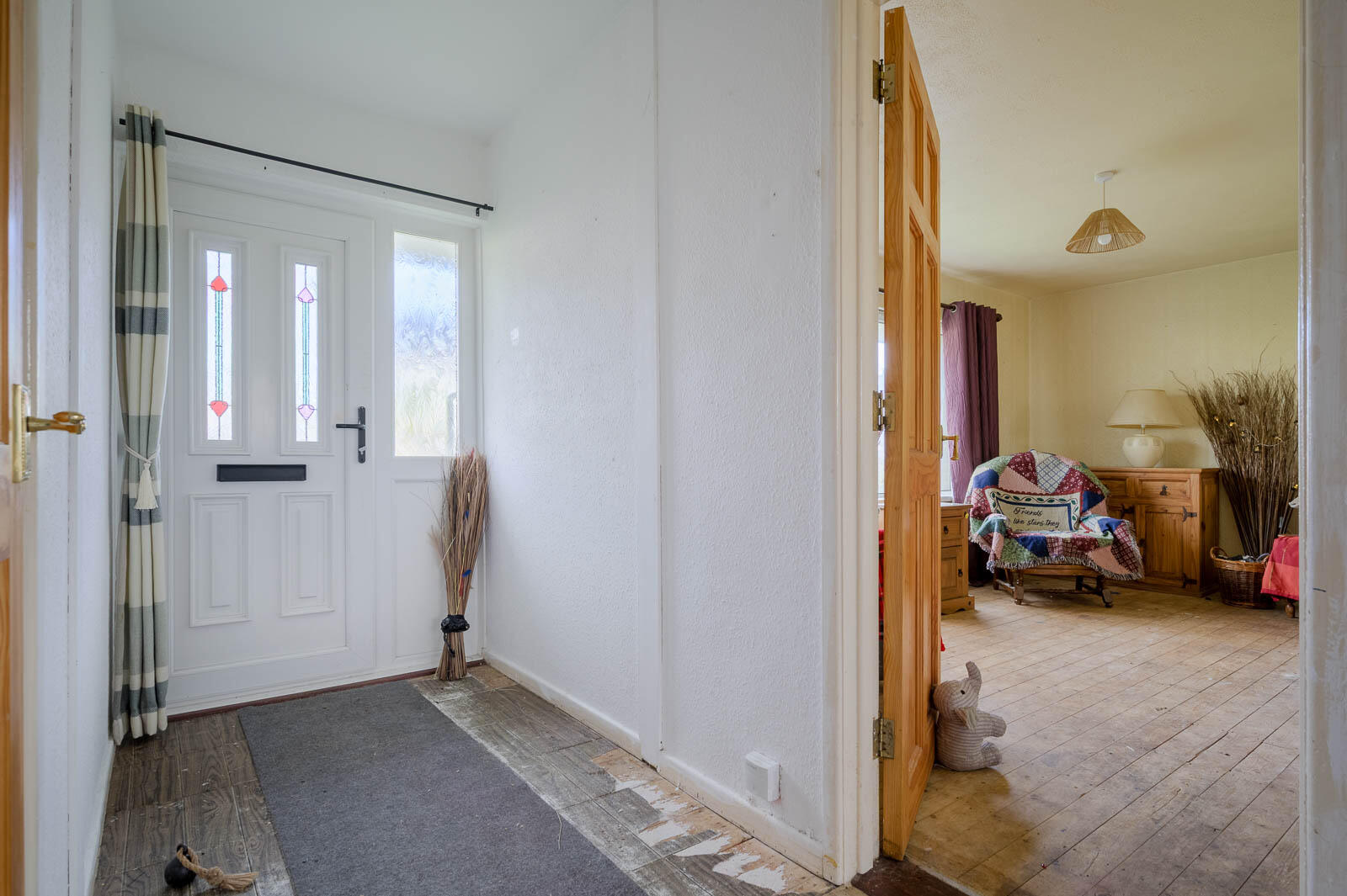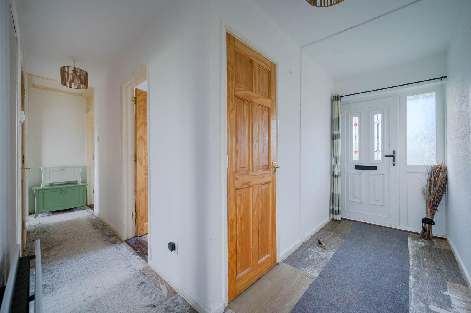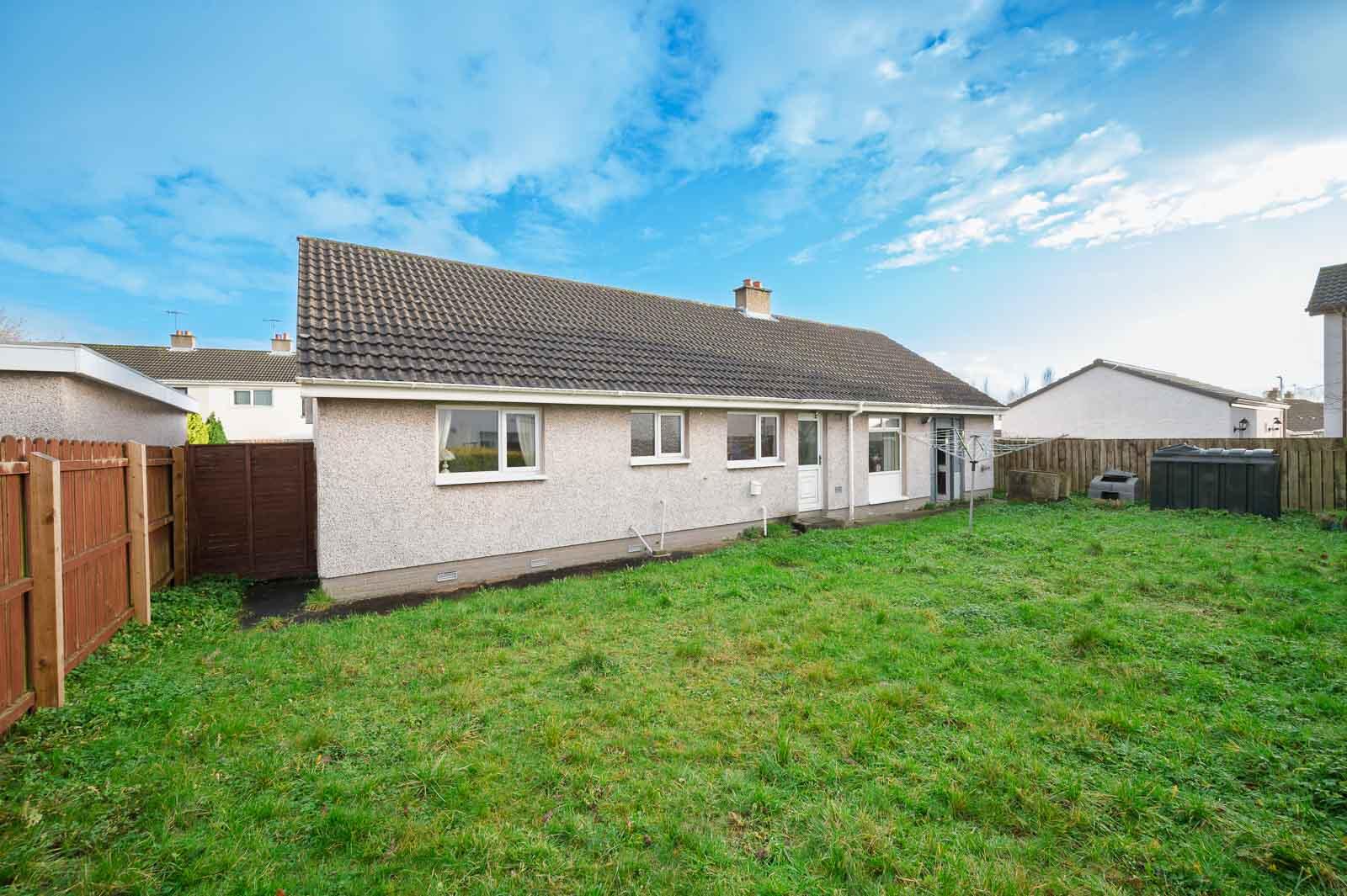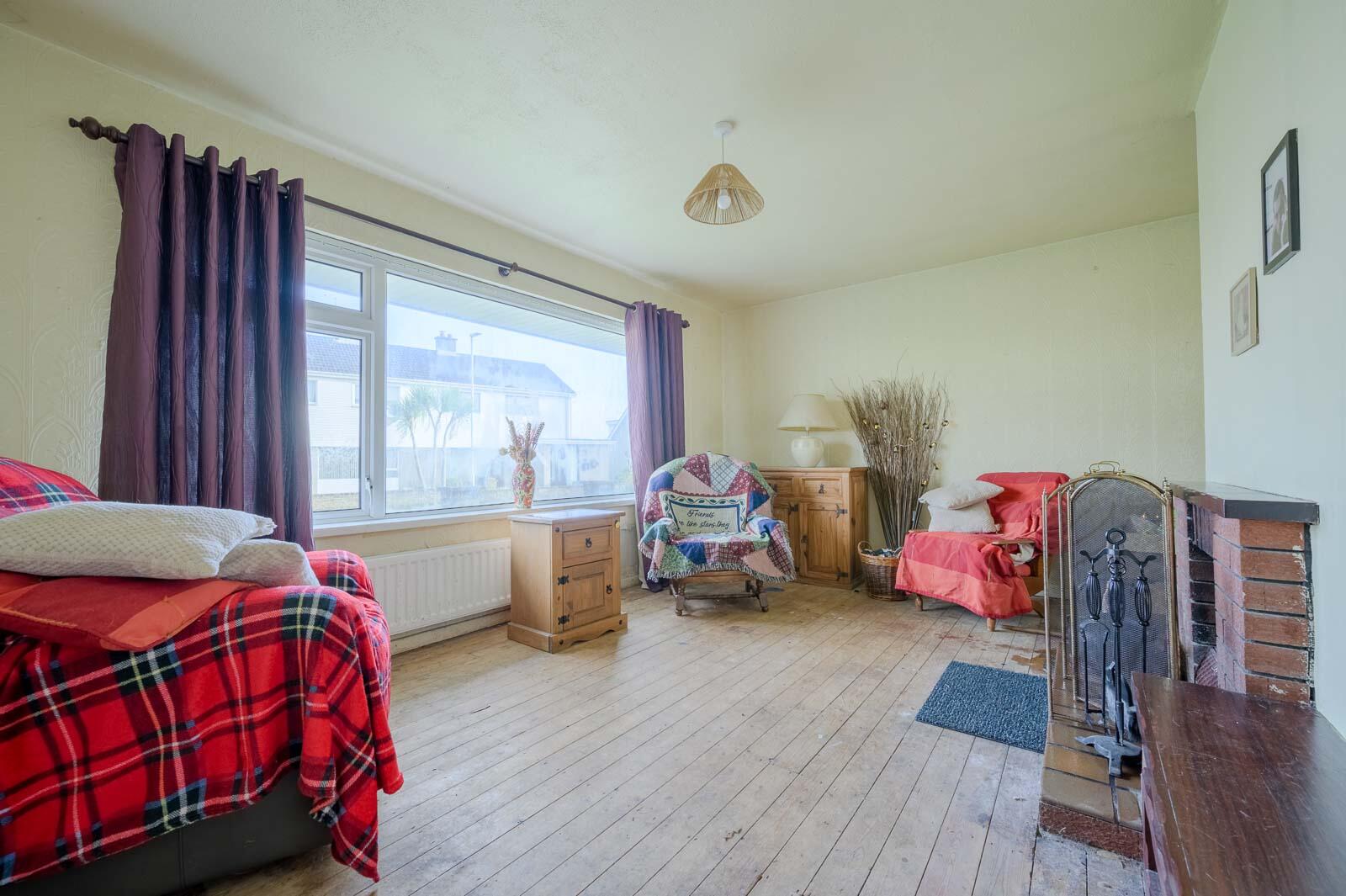 Inside, the layout is well-proportioned, featuring a bright lounge with a large picture window and a traditional fireplace, a practical kitchen with ample storage, and a family bathroom with white suite. The bedrooms offer flexibility for family living or creating a home office.