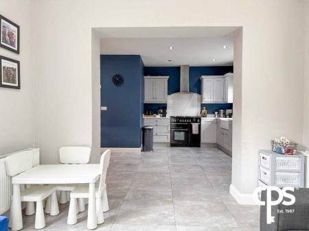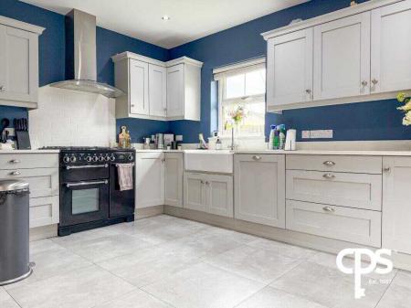 Kitchen (2.71m x 6.67m): A magnificent, fully fitted kitchen boasting an array of high and low units, elegantly topped with stunning Calcutta Gold Quartz work surfaces. It comes complete with integrated appliances, including a fridge freezer and dishwasher, and features a practical double Belfast sink. The tiled flooring flows beautifully through to the dining area and seamlessly into the sunroom.