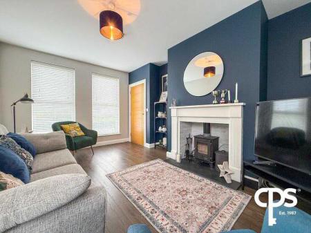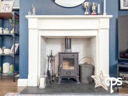 Living Room (3.08m x 4.95m): A comfortable and inviting space with warm wood-effect flooring, centred around a charming pot-belly stove set on a slate hearth with a stylish marble surround, creating a cosy focal point.