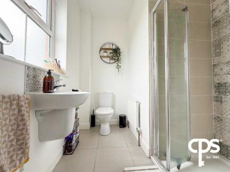 En-suite (2.2m x 2.05m): A modern three-piece suite including a W/C, wash hand basin, and a tiled shower enclosure, all finished with sleek tiled flooring.