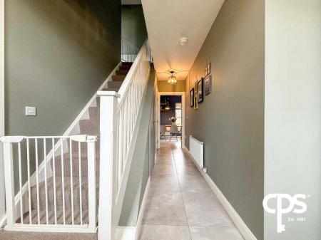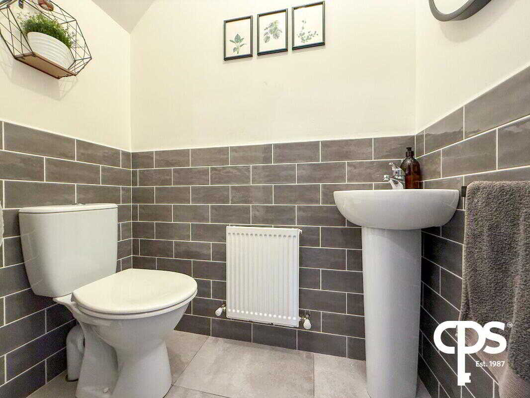 Understairs W/C (1.04m x 1.63m): A convenient ground floor cloakroom with tiled flooring flowing seamlessly from the hall, complemented by chic 1/2 tiled subway walls, and comprising a W/C and wash hand basin.