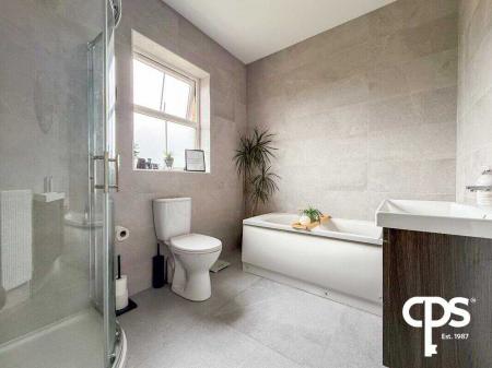 Family Bathroom (2.76m x 2.15m): A luxurious and fully tiled bathroom, featuring a sophisticated stone effect. It comprises a comprehensive four-piece suite with a W/C, wash hand basin, bath, and a corner shower.