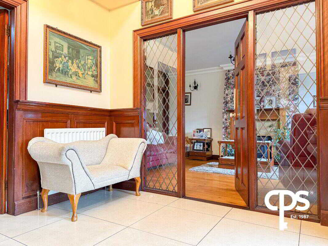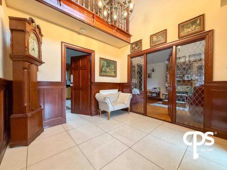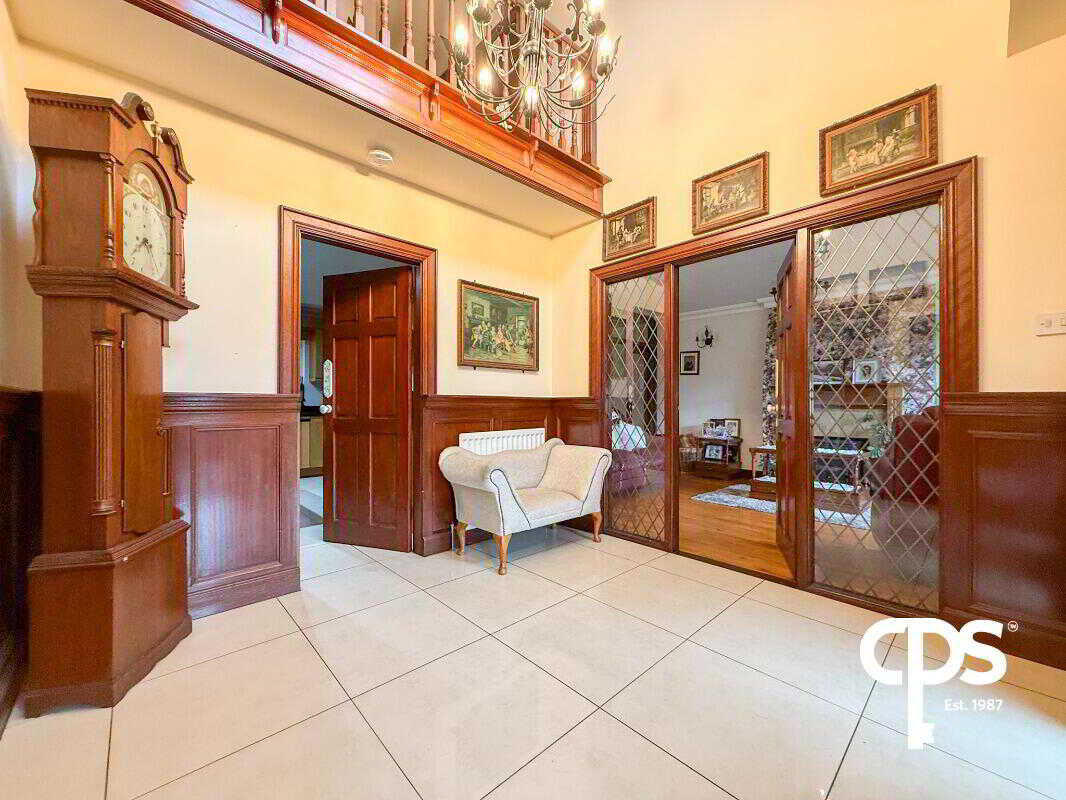 The entrance hall features tiled flooring and a double-height ceiling, creating a bright and welcoming space. Ideal for greeting guests, it leads seamlessly into the reception rooms and dining areas.
