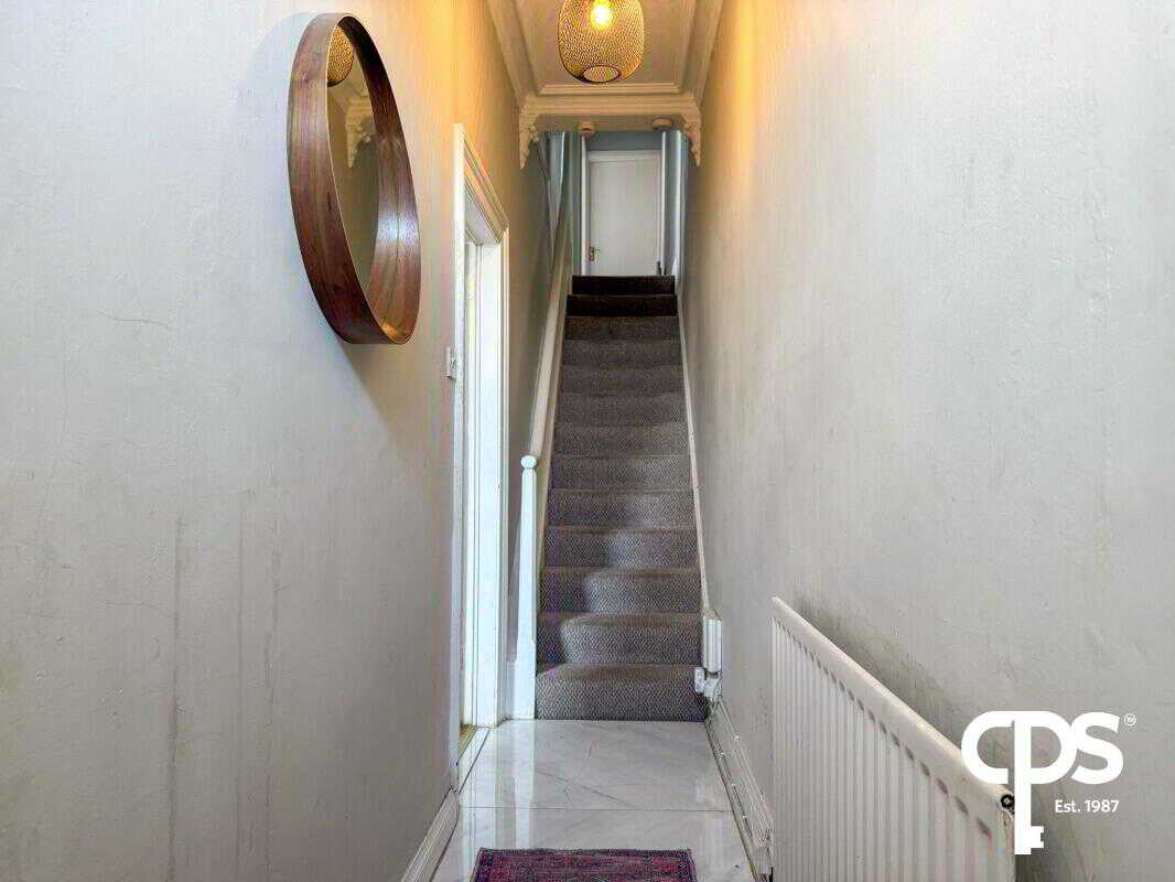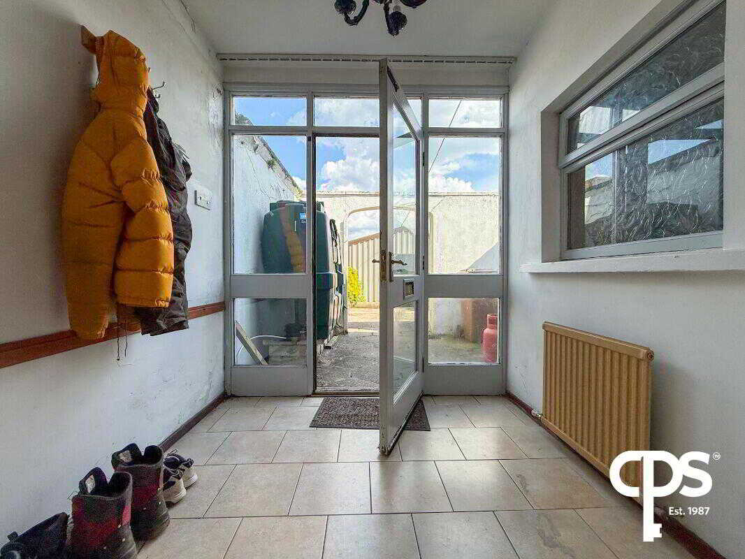 The back hall which is accessed via the utility and carries through the same tiled flooring as the kitchen. The back hall offers ample space and presenting a panelled radiator. Perfect space for coming in and out of the rear of the property to hang coats and to store shoes.