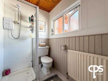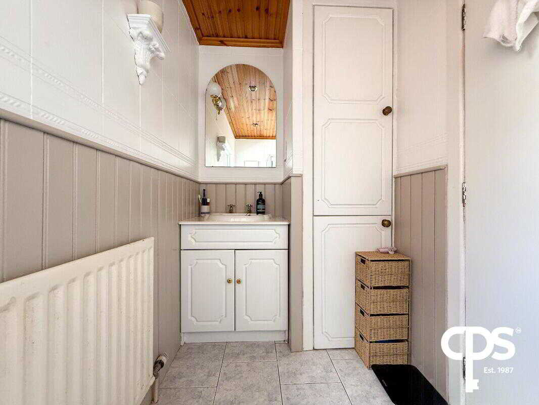 The main bathroom of this property comes with a bright coloured tiled flooring through and is complimented by the light coloured half tiled walling that surrounds the bathroom as well as having half height panelling. The bathroom comprises of 3 pieces which includes corner shower, W/C and vanity style wash basin. The room also benefits from a radiator.