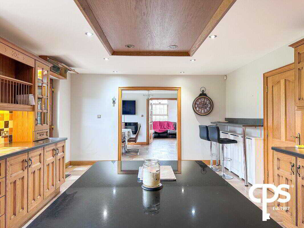 The spacious kitchen offers high and low units with granite quartz work tops throughout, with space for a double sized freezer, space for range cooker hob and an overhead extractor fan. There is also a Belfast style ceramic sink and an integrated under counter dishwasher. Kitchen also has fitted spot lights above. Space also comprises of porcelain tiles through out with a double radiator.
