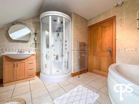 The main bathroom of the property comprises of a four piece suite to include W/C, vanity unit, hand wash basin, corner bath and corner shower fully tiled within with a PVC shower tray. The bathroom comes with tiled flooring throughout with a fully tiled walls to match. The bathroom also comprises of a wall mounted towel radiator.
