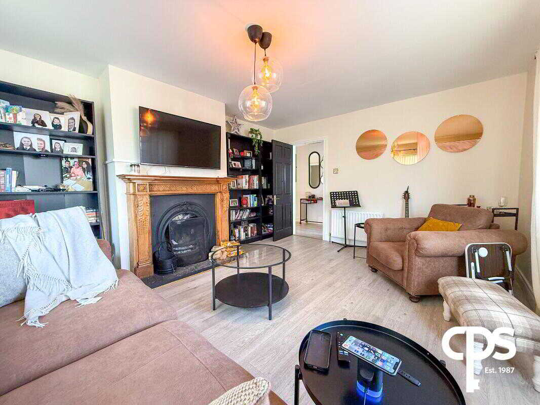 Bright living area with frontal views, laminate wood flooring, open fire with wooden surround, and two double radiators — perfect for relaxing or entertaining.