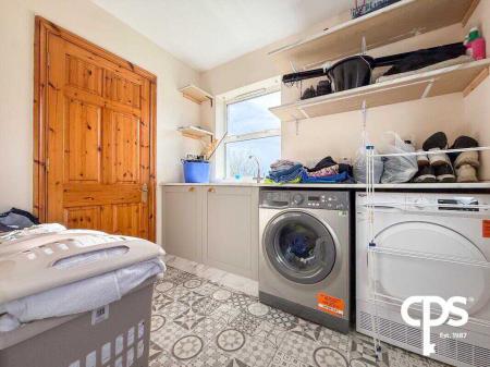 Tiled flooring with space for tumble dryer and washing machine, featuring Cooke & Lewis cabinetry.