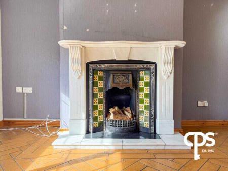 Front-facing living space featuring tiled flooring, an open fire with marble surround, and a radiator. A bright and comfortable room, ideal for relaxing or entertaining.