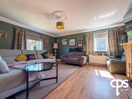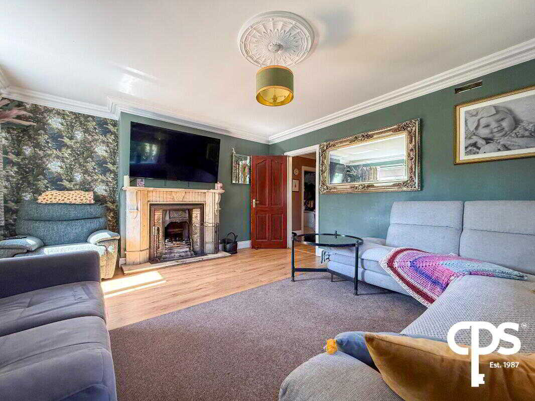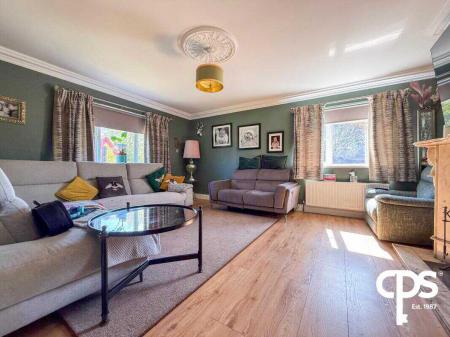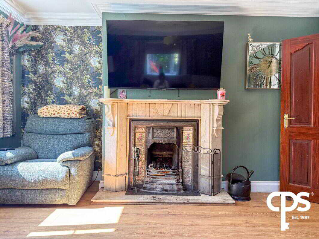 A generous family living space featuring an open fire with decorative mantle, ceiling cornicing and rose detail. Finished with wood-effect flooring and offering multiple electrical and TV points.
