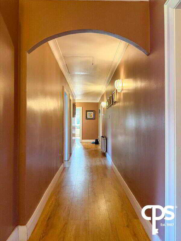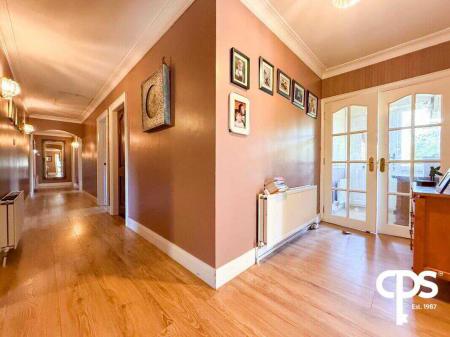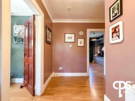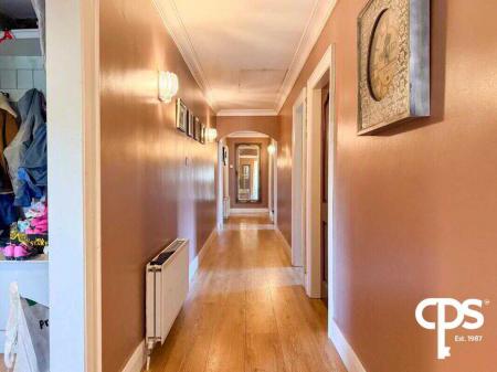 A bright and spacious central hallway providing access throughout the property, complete with wood-effect flooring.
