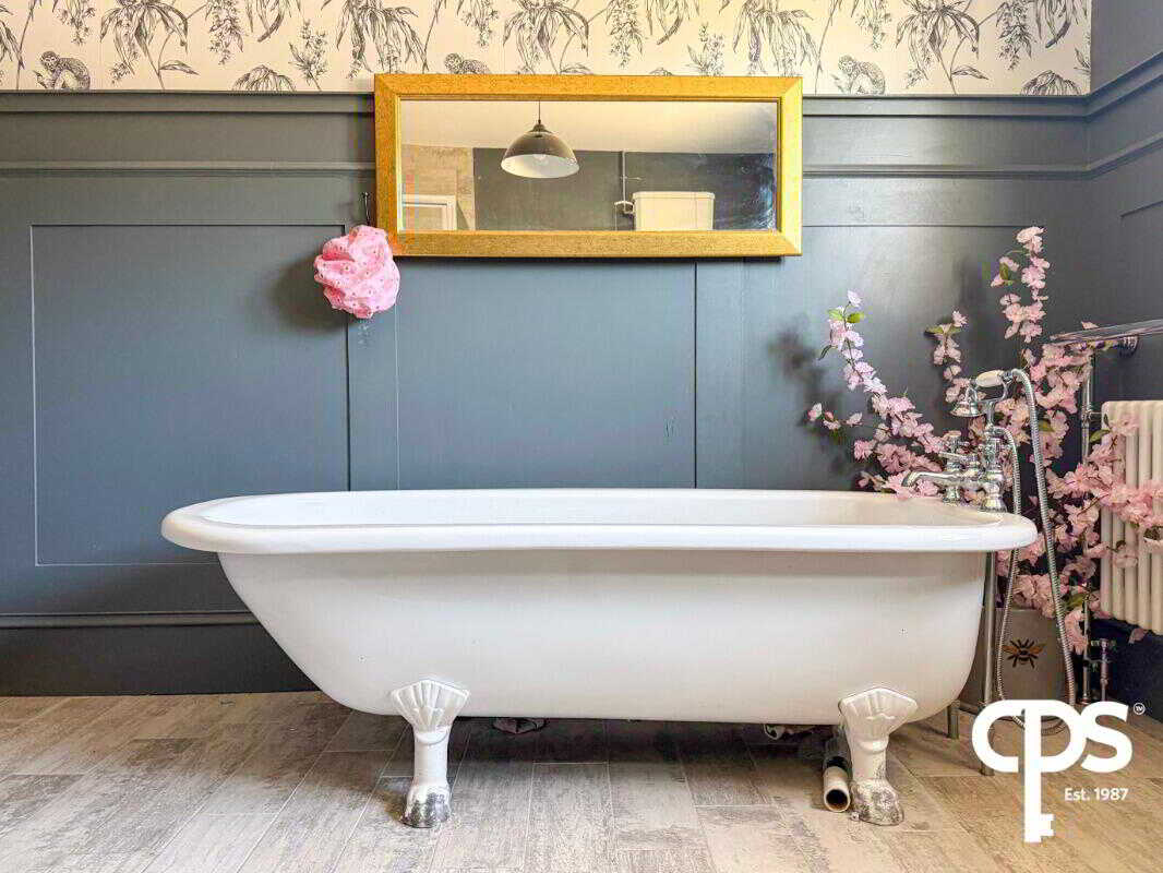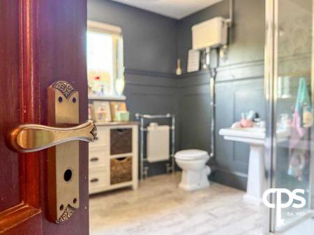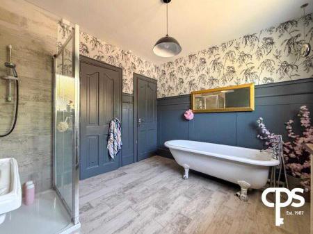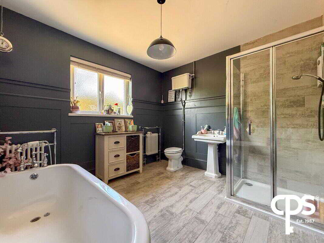 A large family bathroom fitted with a four-piece suite including corner walk-in shower (electric), freestanding bath, WC, and wash hand basin. Finished with tiled flooring and timber wall panelling.