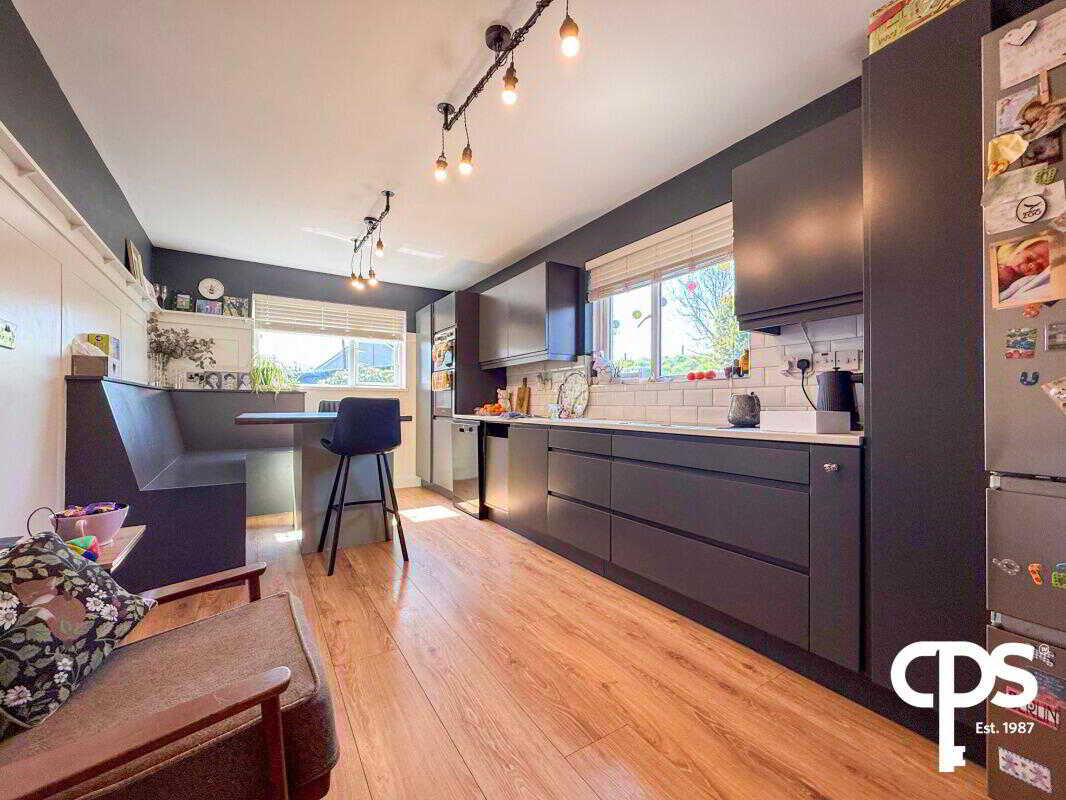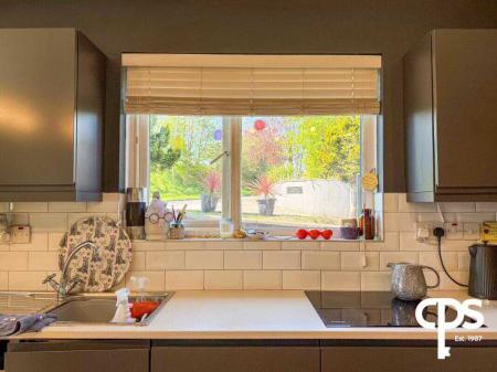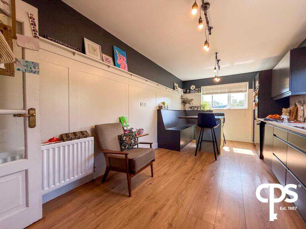 A well-proportioned kitchen with central island seating, a range of high and low level units, and tiled splashback. Includes electric hob, built-in oven and grill, stainless steel sink, and plumbing for a dishwasher. Space is available for an American-style fridge freezer. Finished with wood-effect flooring and timber wall panelling.
