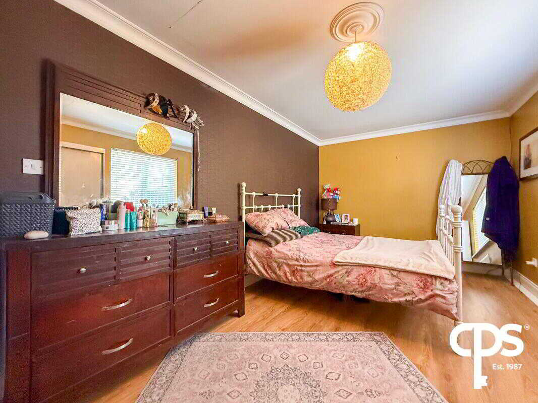 A bright front-facing double bedroom with wood-effect flooring, double radiator, and ample storage.