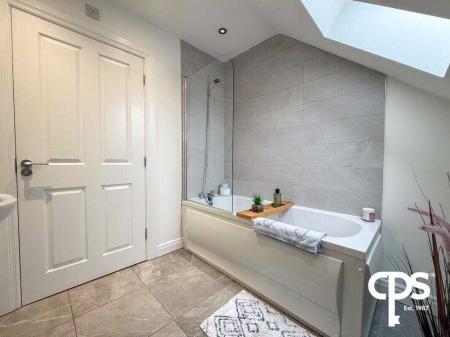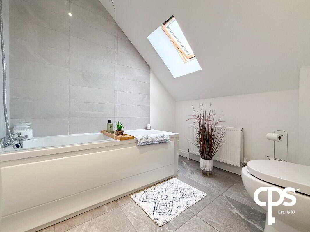 Features a bath with overhead shower, W/C, wash hand basin, Velux window for natural light, tiled flooring, and full tiling around the bath area. Finished with a double radiator.