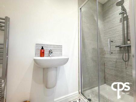 Tiled floor and shower area, power shower, W/C, wash hand basin, and a wall-mounted radiator.