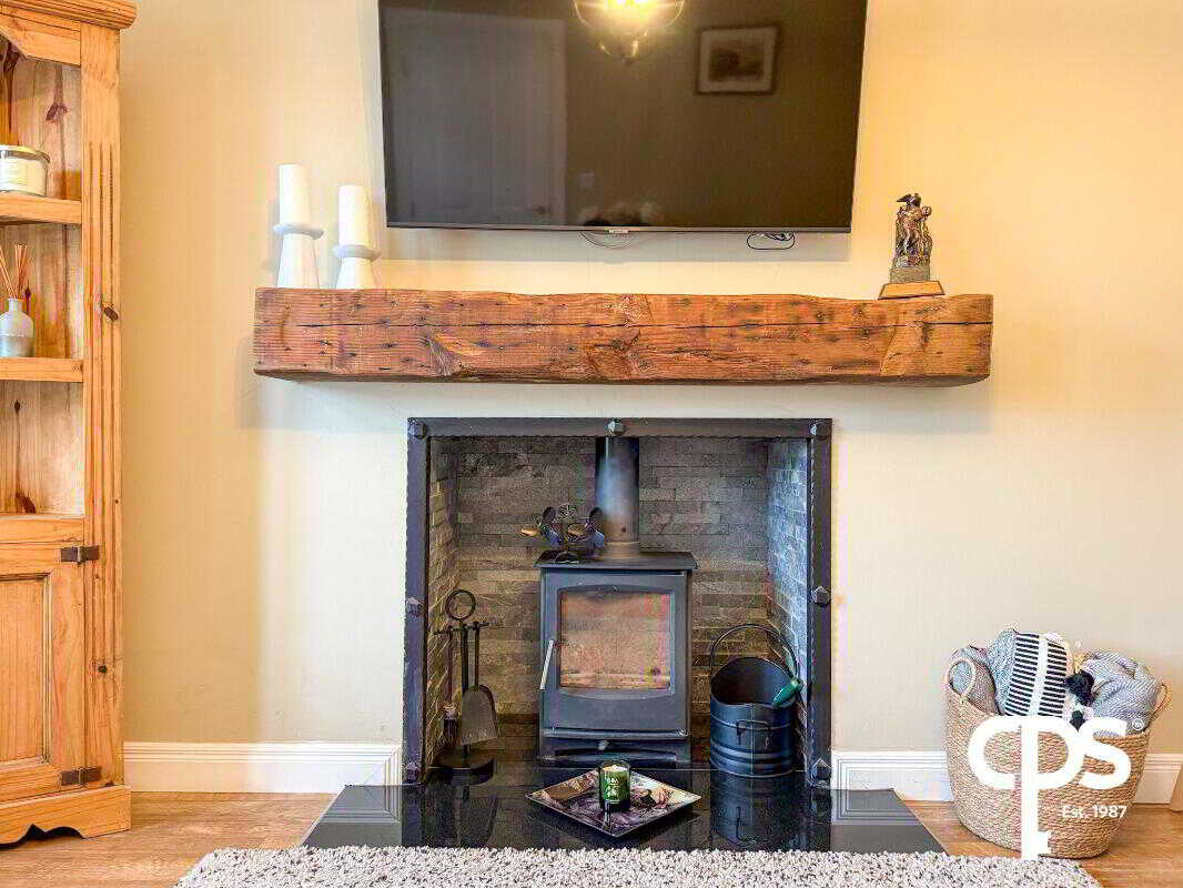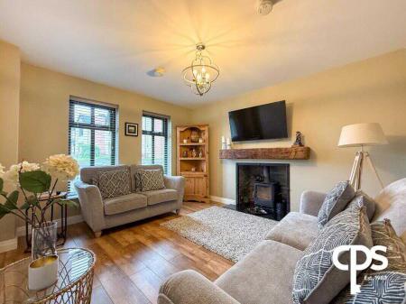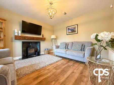 A spacious front-facing room with laminate flooring and a stunning wood-burning stove set on a granite hearth with wooden beam mantle. The room benefits from excellent natural light and features a double radiator, creating a warm and welcoming family space.
