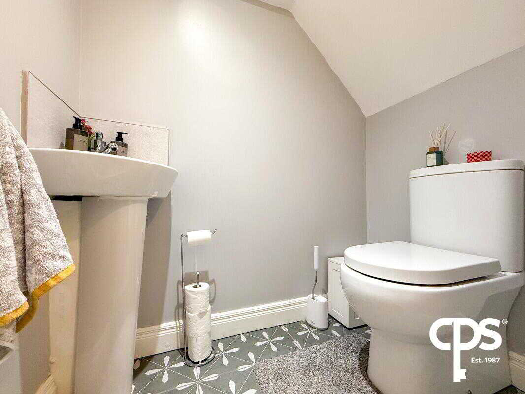 A stylish cloakroom with feature tiled flooring, wash hand basin, and toilet—ideal for guests.