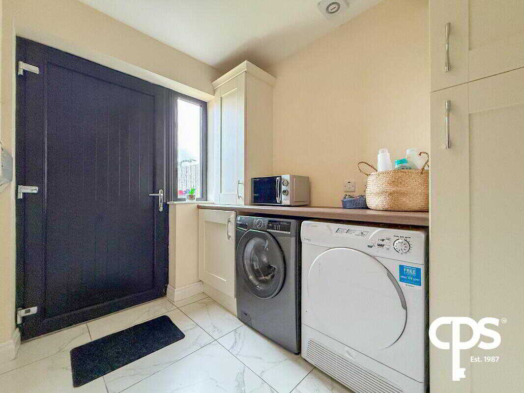 Matching tiled flooring, excellent storage space, and plumbing for both washing machine and tumble dryer. The utility also provides direct access to the rear garden.