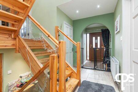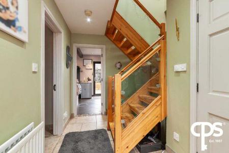 Bright and welcoming entrance with tiled flooring and understairs storage.
