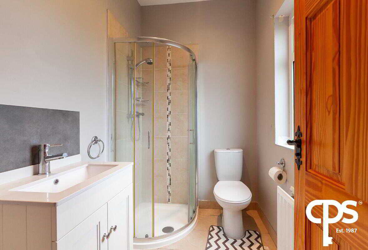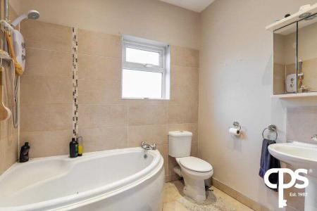 Corner bath, shower, vanity basin, WC, heated towel rail.