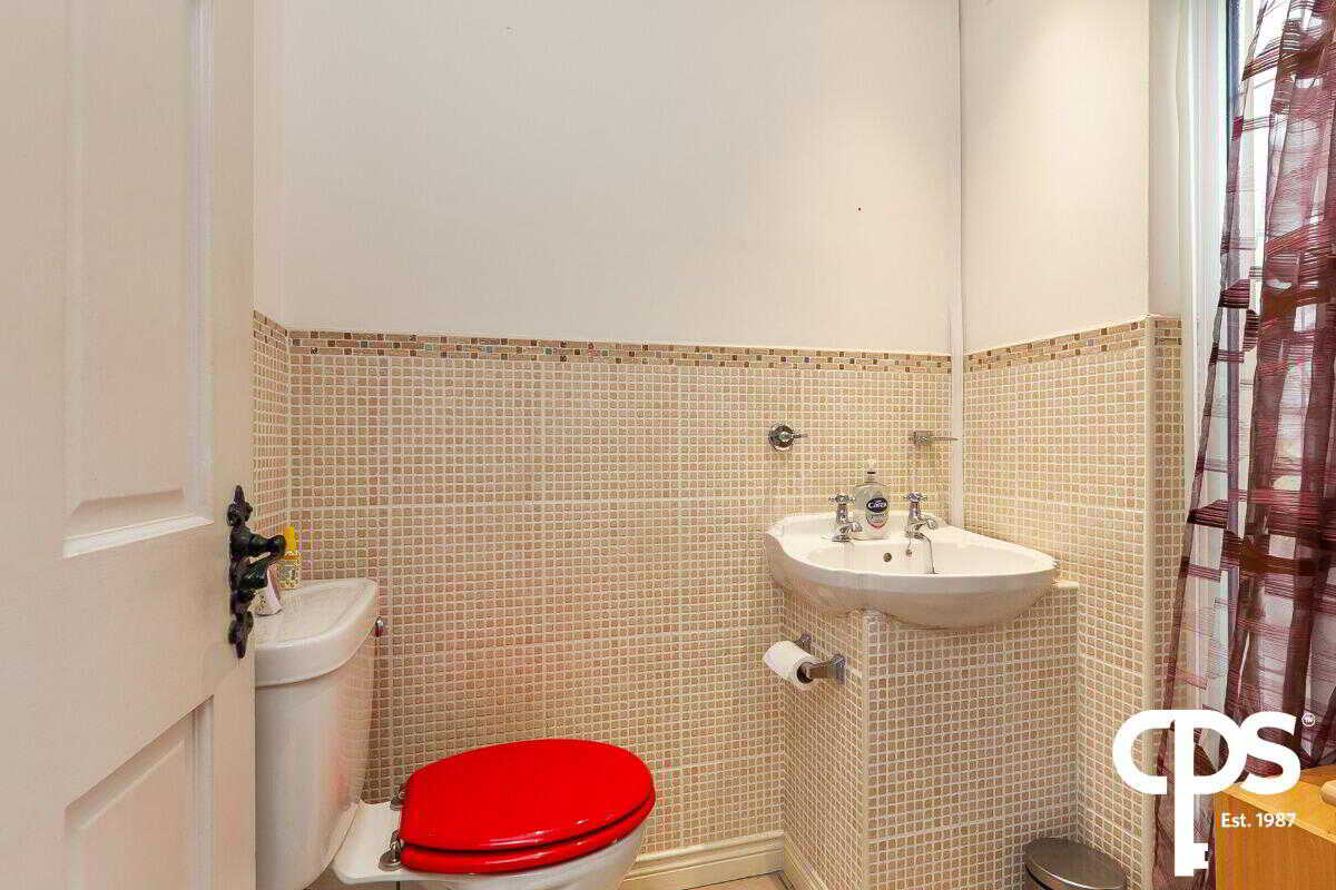 Modern suite with low flush WC and wash hand basin, finished with tiled walls.