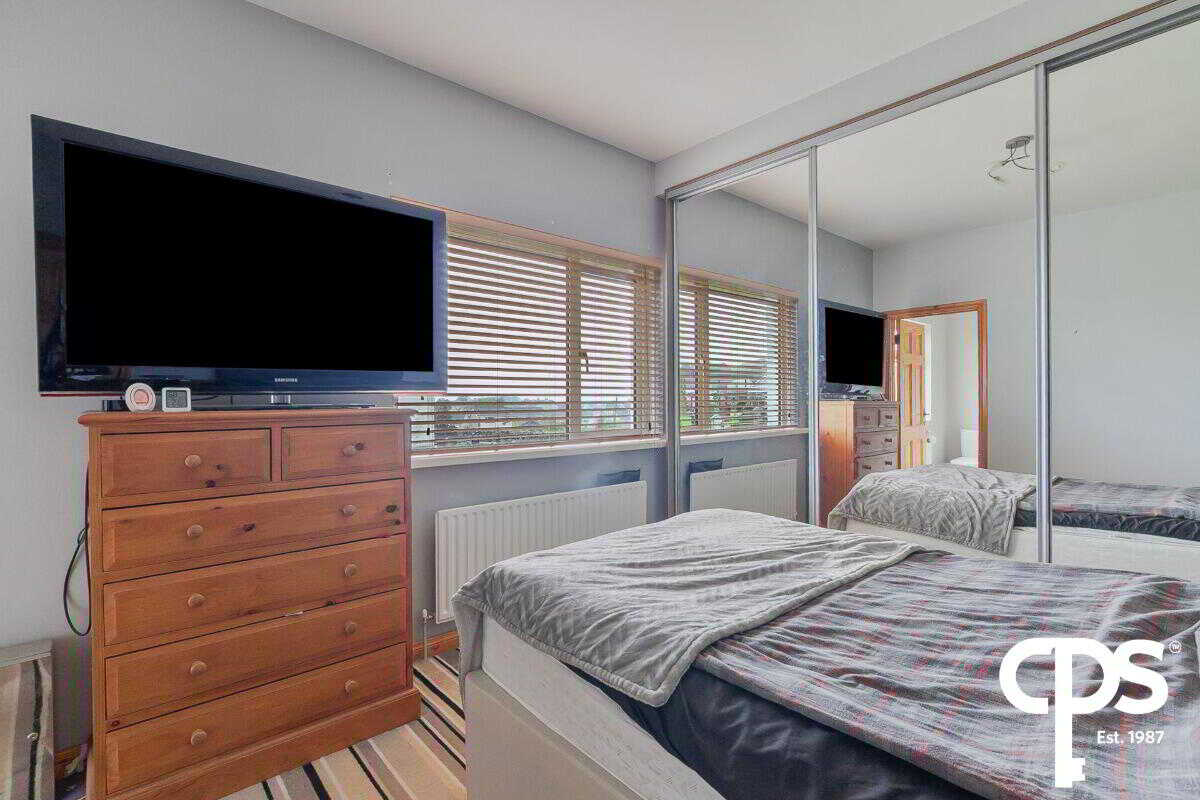 Large bedroom with mirrored built in wardrobes and patio doors to veranda.