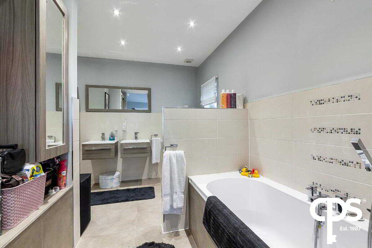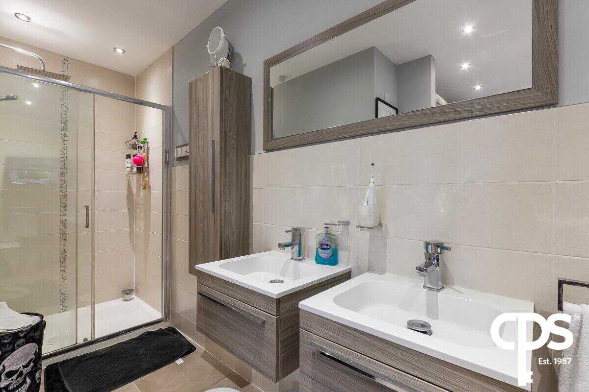 Walk-in shower, twin vanity units, bath, fitted storage.