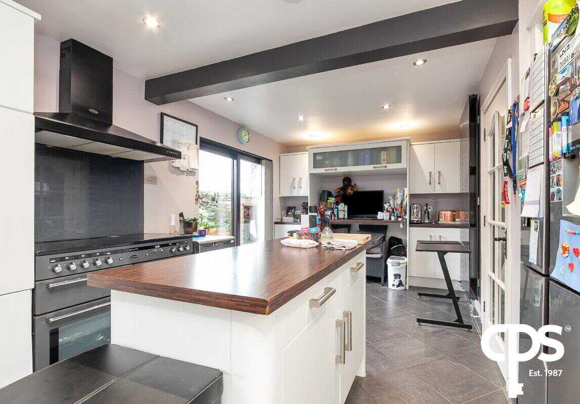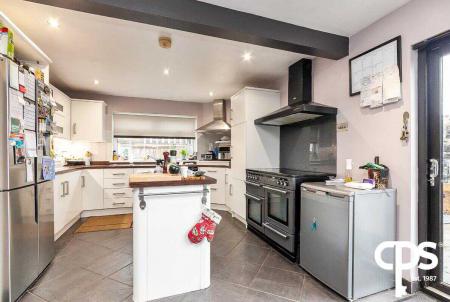 Contemporary kitchen with centre island, display cabinetry, extensive storage, space for American fridge freezer, and patio doors opening to the rear garden.