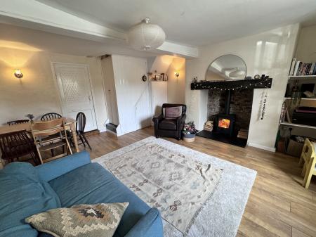 ACCOMMODATION The front door leads through the shared passageway and to an inner hallway, Head in through the FRONT DOOR and in to the LIVING ROOM. This space is lovely and cosy with a beautiful fireplace and Dean Forge multi fuel stove set onto a raised slate hearth with timber lintel over. There is open shelving to one side. A multi framed sash window overlooks the front elevation with shutters and a window seat as well as built in under stairs storage space.