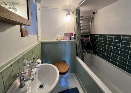 The Bathroom is fitted with a panelled bath with shower mixer tap, tiled surround, wall hung wash hand basin, WC and window to the side with extractor. This space is finished with part panelled walls and period style tiling.