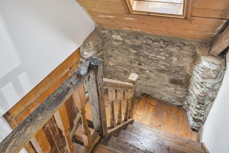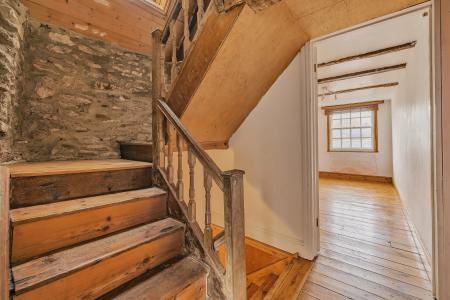The stairs rise again to the second floor and as you pass by exposed stone walls and timber beams and Velux skylight you come to a good sized landing area with door to further under eaves storage.