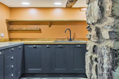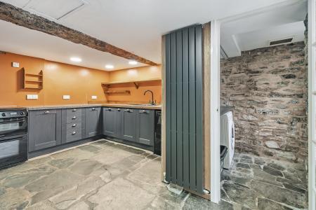 Leading into the KITCHEN/DINING ROOM, a lovely space full of character , with an original flagstone floor, large stone pillar, exposed stone wall and alcove to one side - thought to be originally have housed a kitchen stove but now providing useful storage space. A multi-paned window gives you a glimpse to the rear courtyard. The space is fitted to one side with a range of floor mounted kitchen cupboards with granite and timber work surfaces, one and a quarter stainless steel black sink and swan neck tap as well as open display shelving. There is also space for a dishwasher and gas cooker. This is a great space to cook and entertain.