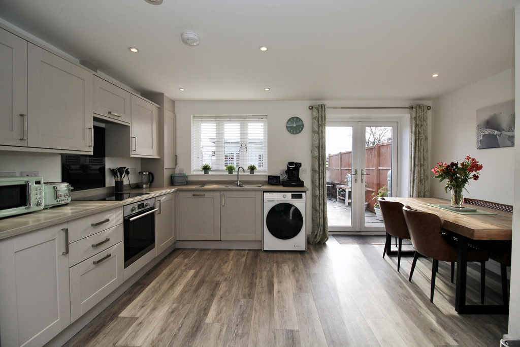 - Generous kitchen/diner with ample space for a family-sized table and chairs, French doors opening to the garden, creating a light and bright social space, with access to the ground floor WC.